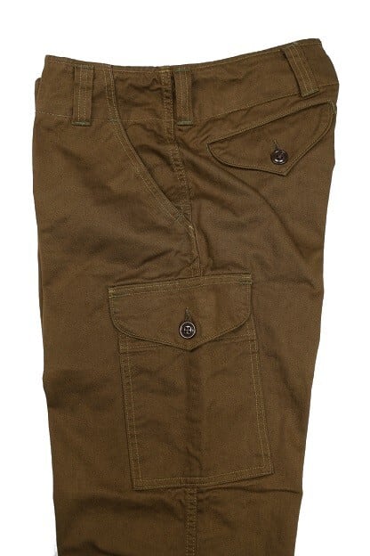 左側に設けられたフラップ付きのカーゴポケット、裾にはストラップが設けられているのが大きな特徴でシルエットは股上を少し浅めにし、ややテーパードをかけたスタイリッシュなシルエットとなっています。