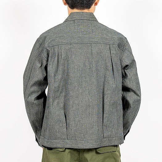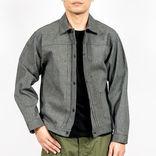 7,5oz程度のインディゴピンチェック素材を使用した本製品は、タテ糸にロープ染色インディゴを使用しヨコ糸が生成りを使用。スタイルはファーストタイプのデニムジャケットをモチーフとしており腰丈程度のジャケットなのでTシャツの上から羽織るにも適しています。