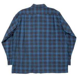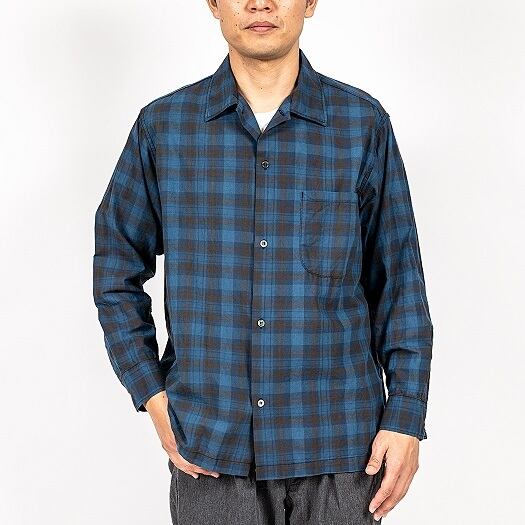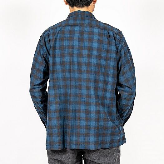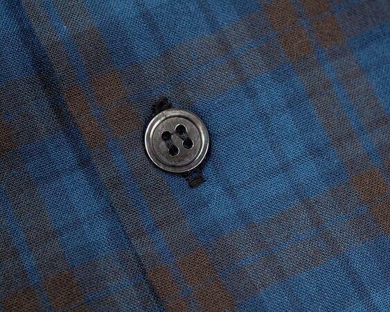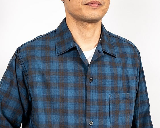 オープンカラーのロングスリーブシャツ。2024SSモデルではリネン100でリリースされていましたがこちらは3オンスクラスのインディゴマドラス、インド製の生地を使用しています。