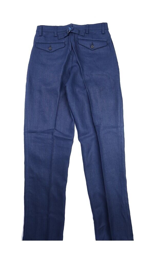 プレインフロント(前にタック無)、サイドの縫い目利用ポケット。バックシンチにフラップ付き玉縁ポケット。
