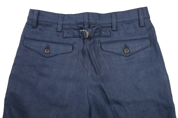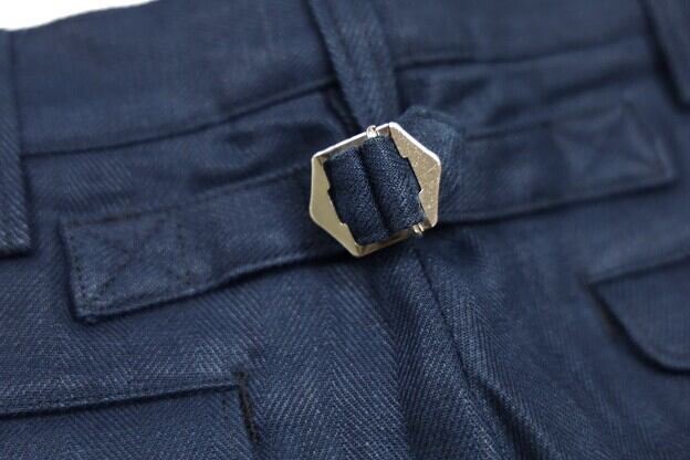 またサイドの縫い目を利用したポケットによって非常にシンプルな佇まいになっています。対してバックはシンチバックにポケットフラップがつく印象的なデザイン。またフロント比翼、尻ぐりの割り部分はパイピング始末で仕上げられています。