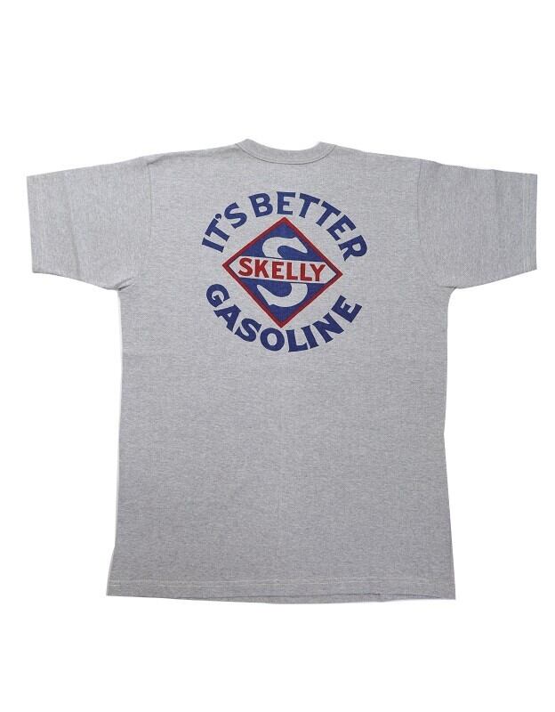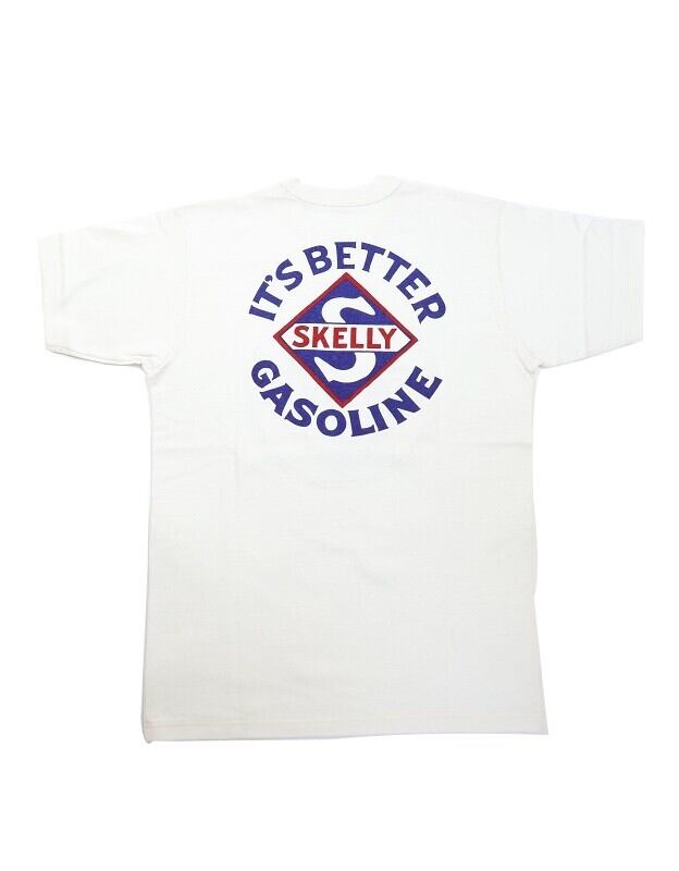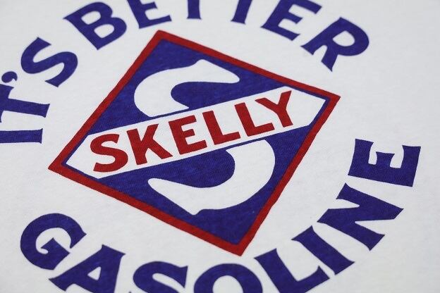 企業のデザイン、モチーフがプリントされており、こちらの製品はフロントにオイルカンパニー”SKELLY"社の染みこみプリントが施されています。また、背面には企業メッセージが