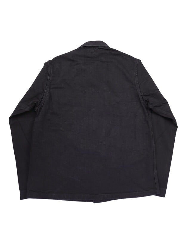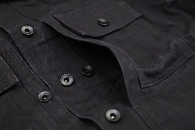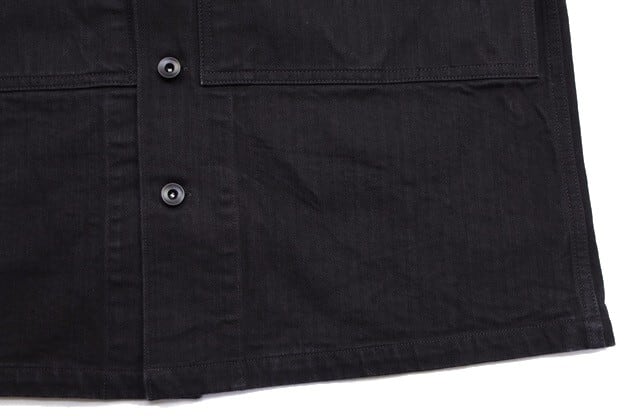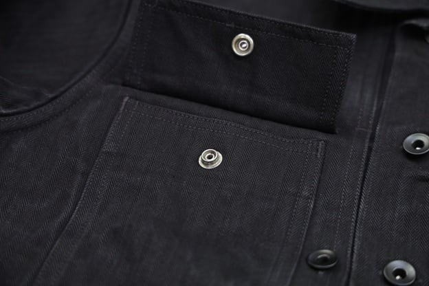 素材に使用される14ozブラックへリンボンは、タテ糸にロープ染色、ヨコ糸にチーズ染色の