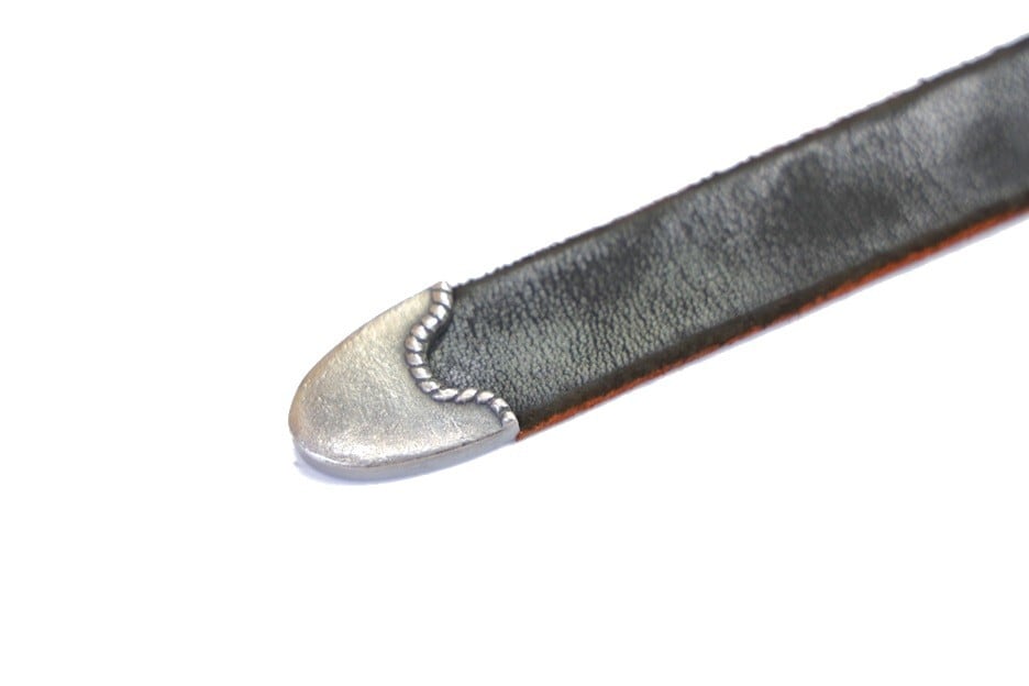 スタイルは特徴ある彫刻が施されたバックルに、剣先にも真鍮製金属プレートが付く
