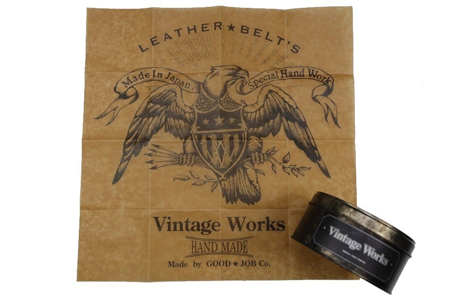 【VINTAGE WORKS】ではベルト1本につき、専用のスチール缶ケースとブランドロゴが入ったワックスペーパーが付属します。ベルトを収納しておく時にも嵩張らずに整理できますし、もちろんその他の収納用途にも、インテリアとしても馴染む一品。
