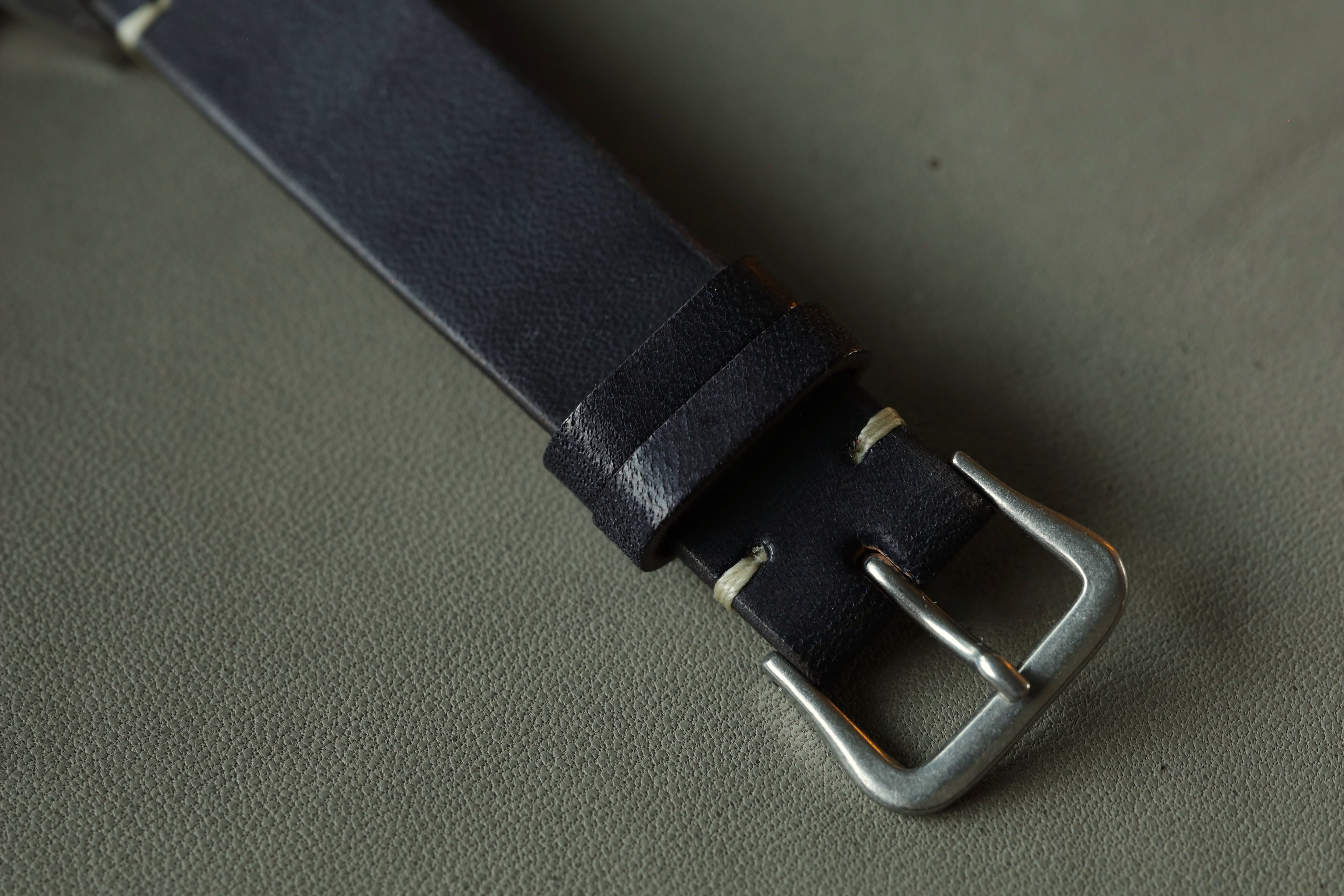 姫路でフルベジタブルタンニン鞣しされたキップレザーを使用し"丘染め"と呼ばれる伝統的な手染め製法で染め上げ、独自のコガシ加工を施すことでヴィンテージのような風合いに仕上げた「オールドオイルレザー」を使用したレザーバンドとなります。