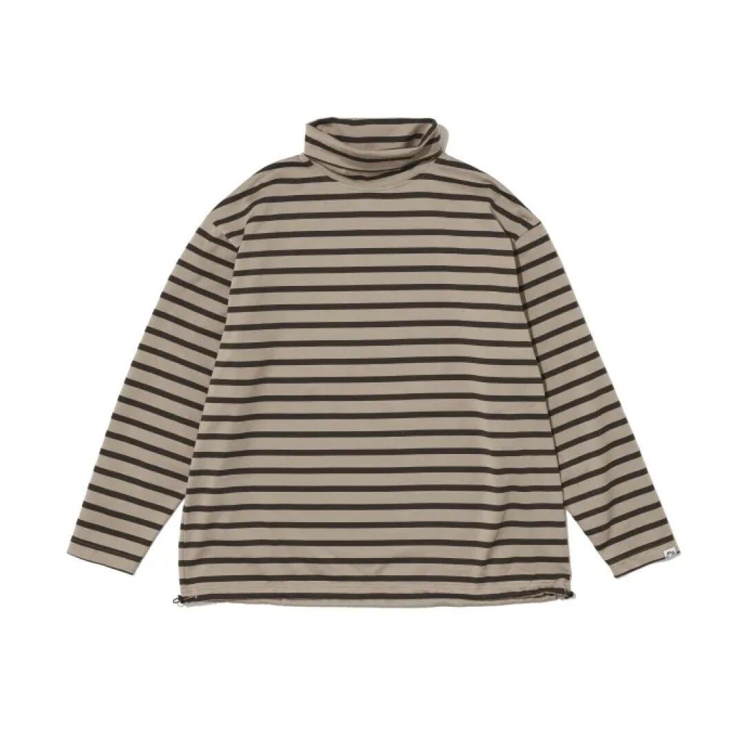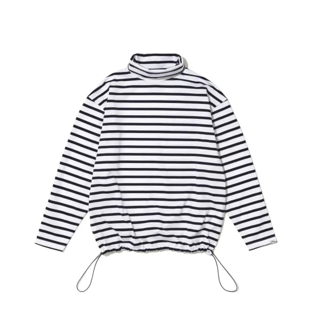 CMFシリーズお馴染みのボーダーTEE。今季はインナーダウン等に合わせれるようにモックネックで製作。ボディは高密度でハリ感のあるコットン素材を使用し、裾に変化を出せるよう、ドローコードで絞る事が可能となっています。着用時のバランスも非常に良く、トップスとして主役になってくれる一着です。