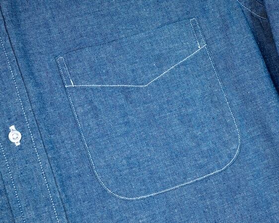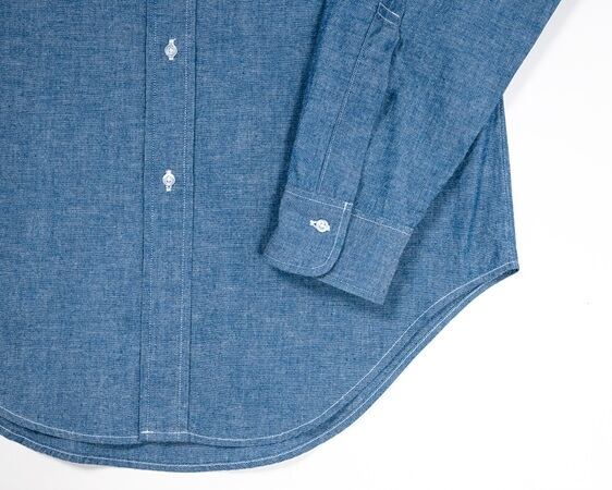 素材にはコットン100%の5オンスクラスシャンブレー地を使用。ムラ感の強い糸をあえて使用していないので、所謂アメカジ的なゴリゴリの色落ちではなく、綺麗なブルーの色落ちをお楽しみ頂けます。