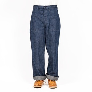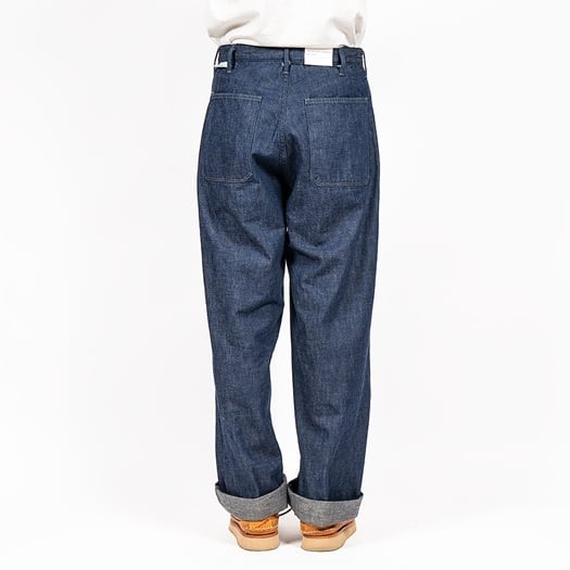 ヨコ糸をブラウンに染めたインディゴデニムは、やや色味が沈んだ表情でこのあたりも古いミリタリーデニムをイメージさせる色調。WORKERSでは今回【Vintage Fit】モデルと【Slim Fit】モデルが用意され、当店では【Vintage Fit】モデルをセレクト。股上は深く、太幅のストレートは、元ネタオリジナルを再現したシルエットで、裾幅は25cm程度あるため、風の抜けも良く、涼しく快適に着用していただけます。