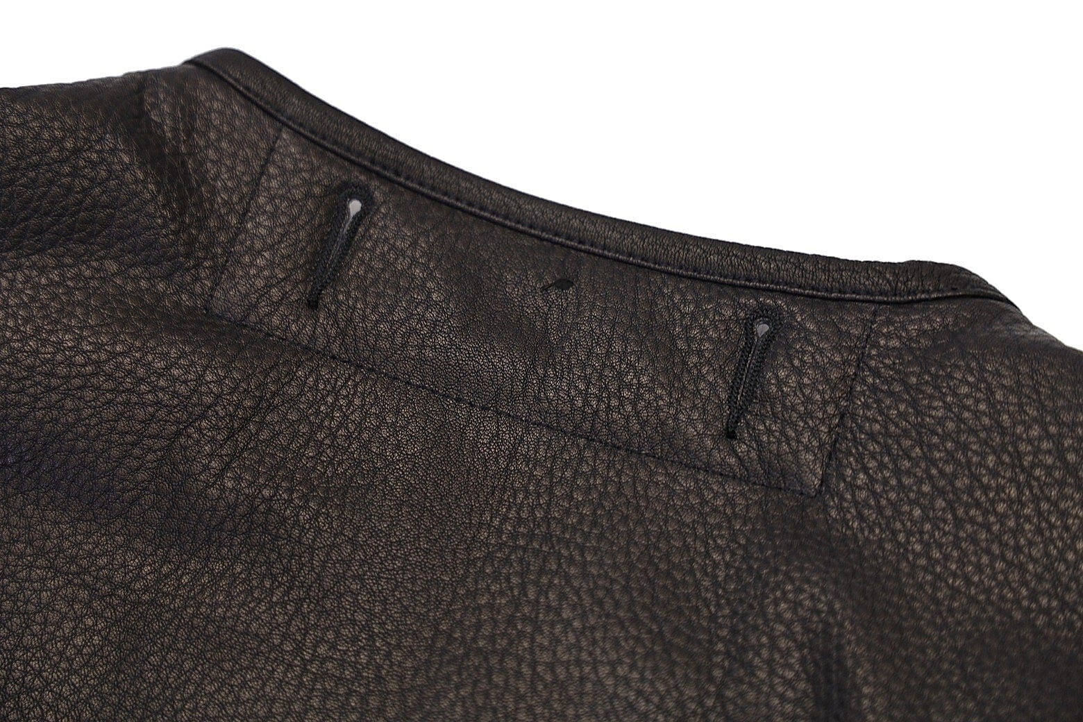 素材には1,2mm厚のディアスキンを前後左右の身頃でそれぞれ一枚革で使用。厳選されたディアで、尚且つここまで大判で革を使用出来る事も素晴らしく、接ぎが無い一枚革だからこそ拘ったレザーのドレープ感を表現。