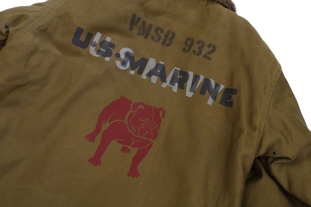 第一次世界大戦の際、ドイツ軍に恐れれたアメリカ海兵隊のニックネーム( TEUFELHUND 地獄の犬)が由来となっている今回のカスタム。右胸に入るワッペンVMSB932部隊のスコードロンパッチ。ヨコに向いたブルドッグに羽が生えたデザインは、オリジナルでは非常にレアなデザインでリプロダクトなどでも様々な種類があるようです。今回もフリーホイーラーズではフェルトに綿糸で非常に雰囲気良く製作されています。