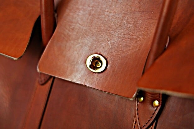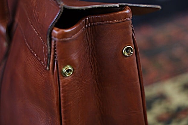 フラップは特注の真鍮製ヒネリで開閉可能。ライナーは堅牢度に優れた、キャンバス地を使用しており利便性の高いA4対応サイズです。内装にはポケットが3つ設けられています。