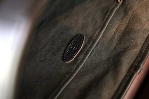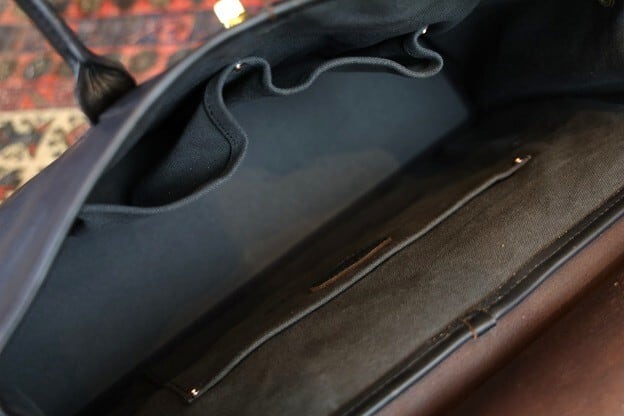 フラップは特注の真鍮製ヒネリで開閉可能。ライナーは堅牢度に優れた、キャンバス地を使用しており利便性の高いA4対応サイズです。内装にはポケットが3つ設けられています。