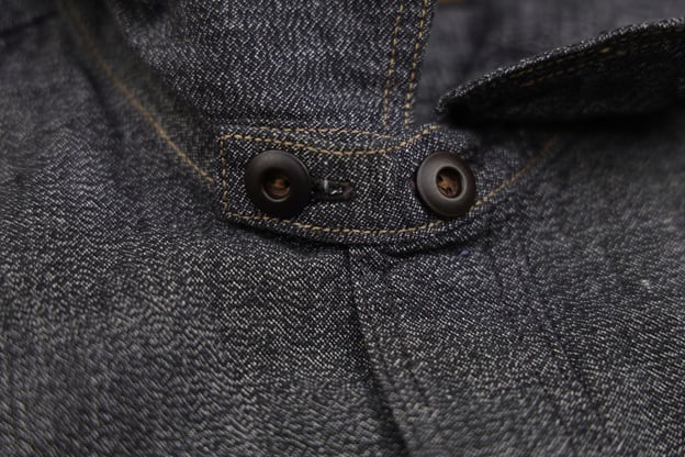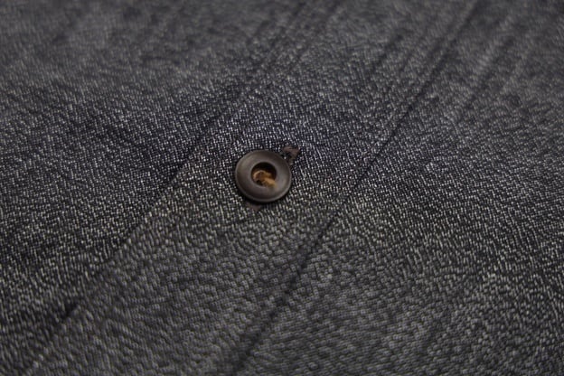オリジナルシャンブレー生地は、ムラ糸チャコール系の糸に生成りの糸を撚り合わせた双糸を使用し、旧式織機で織りあげられた、クラシック且つ非常に風合い豊かな生地を使用しており