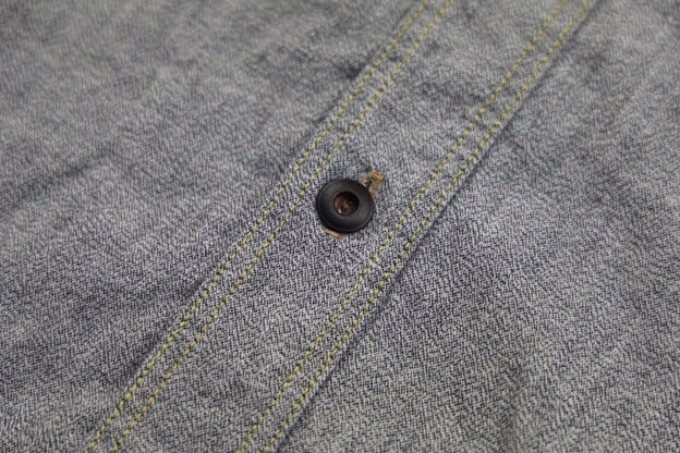 オリジナルシャンブレー生地は、ムラ糸チャコール系の糸に生成りの糸を撚り合わせた双糸を使用し、旧式織機で織りあげられた、クラシック且つ非常に風合い豊かな生地を使用しており