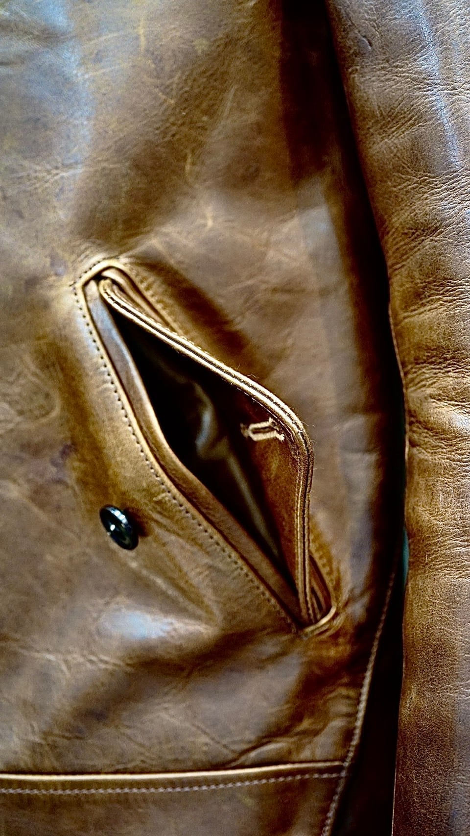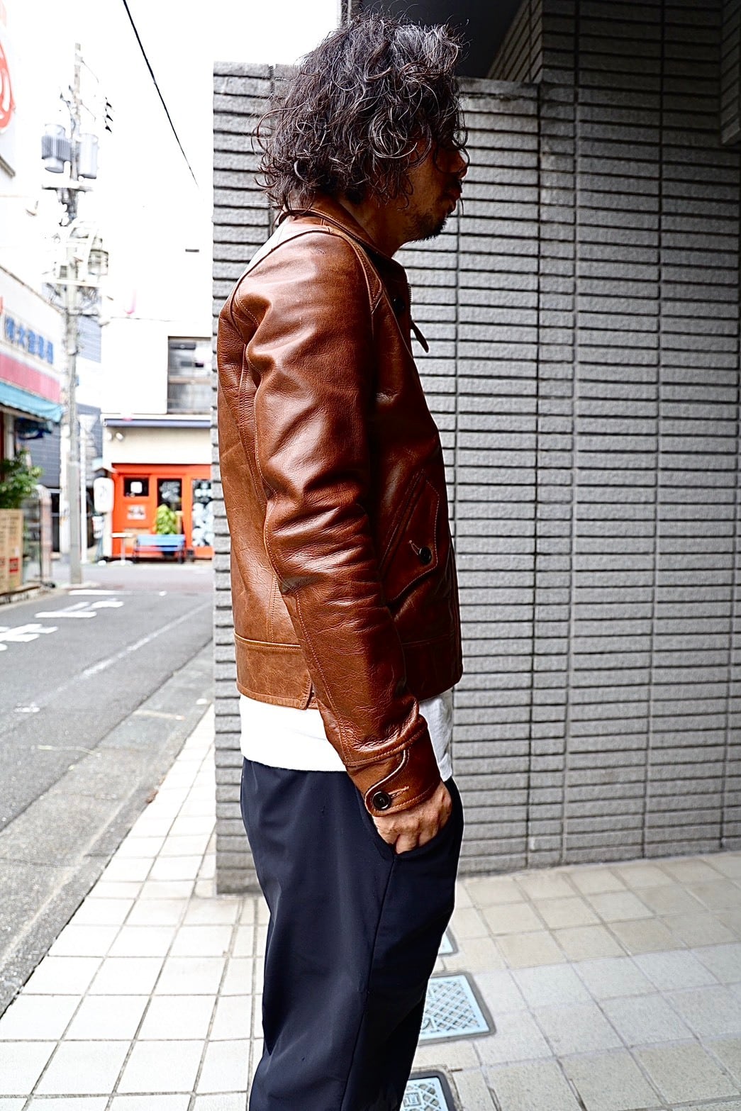 ポケットフラップや身頃裏のポケットを凝ったデザインで構成し、袖口裏にはコーデュロイを採用。多指革、オイル感のあるレザーはシワやアタリによって革がプルアップし、立体感ある表情の変化が見られます。また擦れなどにより茶芯が現れる表情豊かな経年変化をお楽しみ頂けます。