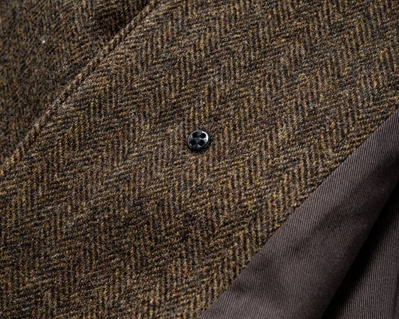 リサイクルしていないバージンウールの糸で作った生地となります。生地自体、糸の織り密度もあるためある程度風も防いでくれる且つ価格も輸入物に比べれば手頃。でも、風合いは輸入物にも負けていない。ヘビー過ぎない8ozのツイードは、コートにしても重すぎず着づらくないという事で使用されています。