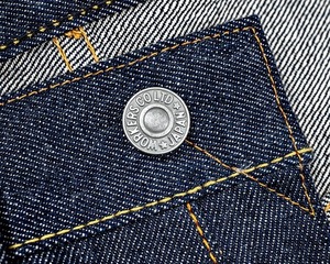 デニム生地を使用してジーンズは製作されてきましたが、本作では米綿でタテ7番×ヨコ6番の 14,7ozと定番より1オンスほど重くて厚い生地を製作。インディゴも定番モデルよりも濃色に、ややタテムラ感が強くなった生地を使用しています。