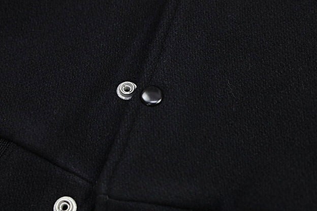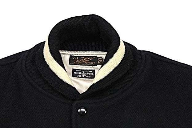 今回フリーホイーラーズでは1940~50sのカークラブジャケットをモチーフとして製作。前作で登場した"SPEED BUG"よりも古い前期モデルをイメージしており、襟は折り返すショールカラー、袖付けはセットインスリーブ、フロントはファスナー仕様ではなくスナップボタン(黒塗装)で開閉できるようになっているのも特徴です。