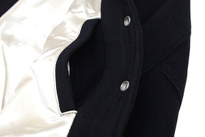 メインマテリアルとして、表面はウールメルトン(Wool90 Nylon10)を使用し、裏面はレーヨンコットンサテン(Cotton58 Rayon42)を使用。先染めのウールメルトンは、あえて綾目が立ったヴィンテージの表情に拘り太番手の糸をゆるく編立てており、当時の雰囲気を感じさせる表情が非常に魅力ある仕上がりとなっています。