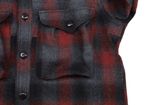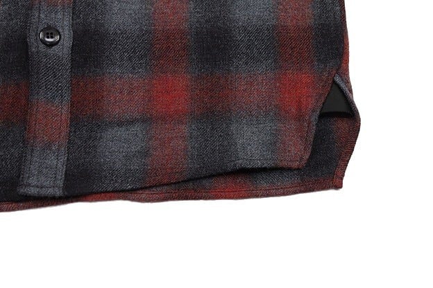 襟はレギュラーカラー、胸まで重なるヨーク部分が特徴で、両胸にはフラップポケットが付きますがマチ付きの大型ポケットとなり、実用性も高い収納性があります。裾はスクエア形状となりますが、脇にはマチが設けられる珍しいデザイン。ボタンにはトップに15mm、その他は19mmの大型ナットボタンを使用。高級感ある贅沢な仕様。また袖にはエルボーパッチが設けられています。着丈は裾を出しても着やすい長さで、ざっくり羽織るのも良いバランスの一着となっています。メリノウールオンブレチェックの起毛感ある表情、風合いが素晴らしく、着込む事で更に経年変化を楽しめる一着です。