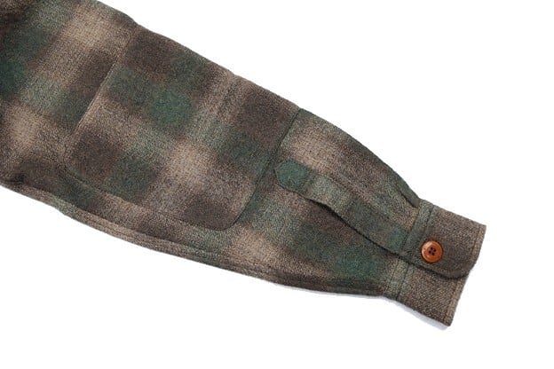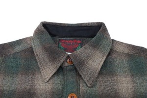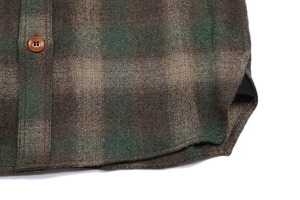 襟はレギュラーカラー、胸まで重なるヨーク部分が特徴で、両胸にはフラップポケットが付きますがマチ付きの大型ポケットとなり、実用性も高い収納性があります。裾はスクエア形状となりますが、脇にはマチが設けられる珍しいデザイン。ボタンにはトップに15mm、その他は19mmの大型ナットボタンを使用。高級感ある贅沢な仕様。また袖にはエルボーパッチが設けられています。着丈は裾を出しても着やすい長さで、ざっくり羽織るのも良いバランスの一着となっています。メリノウールオンブレチェックの起毛感ある表情、風合いが素晴らしく、着込む事で更に経年変化を楽しめる一着です。