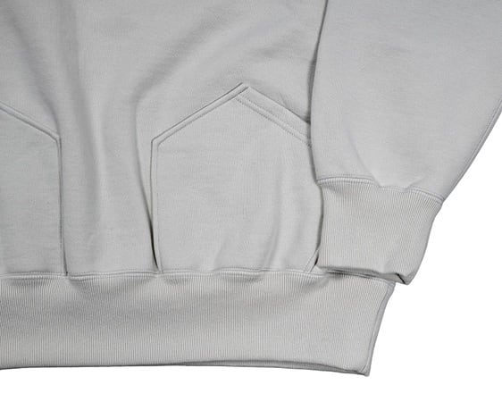 フロントポケットは古いヴィンテージでも見られるセパレートポケット仕様。身頃のパターンはビンテージの「着丈が縮んじゃった」感 じは再現しつつ身幅はしっかりある。めったに見つからない「大きいサイズのビンテージ」を新品から再現しており、そのあたりは単にシャープなシルエットの着丈が長いスウェット、ではなくWORKERSらしいアプローチで製作されたヘビースウェットシャツとなっています。