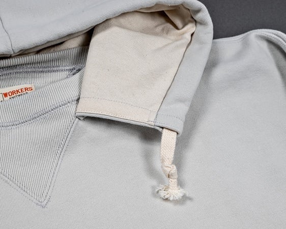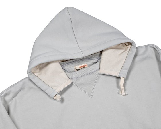 WORKERSで製作される15ozのヘビースウェット地を使用した後付けパーカー。裏起毛をかけたスウェットは、型崩れしにくい、けど化繊を使っていないので着用感はしなやか、というWORKERSが提案する冬用スウェットに仕上げられています。