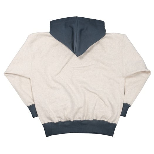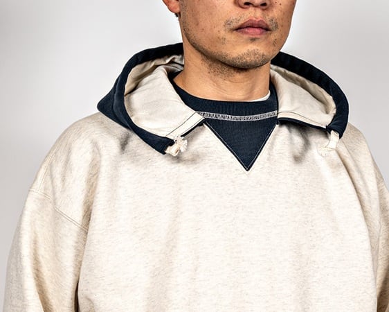 ヴィンテージでも王道且つ高額で手の届かない存在となった後付けフードパーカー。単純に襟を後付け…ではなく、先にクルーネックのボディを作ってから最後にフードが取りつけられます。また着用時のフードの形状や、洗濯時の乾きやすさも考え、フードの裏を切り替えにしてボディの裏毛よりは薄いT シャツ生地を使用しています。