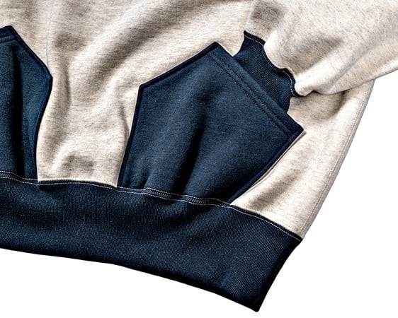 フロントポケットは古いヴィンテージでも見られるセパレートポケット仕様。身頃のパターンはビンテージの「着丈が縮んじゃった」感 じは再現しつつ身幅はしっかりある。めったに見つからない「大きいサイズのビンテージ」を新品から再現しており、そのあたりは単にシャープなシルエットの着丈が長いスウェット、ではなくWORKERSらしいアプローチで製作されたヘビースウェットシャツとなっています。