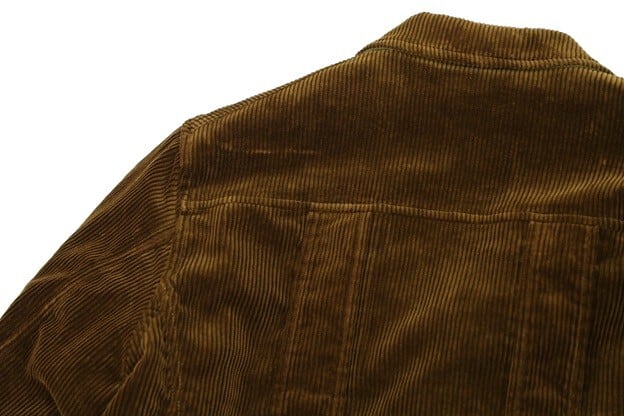 Aラインの適度にゆとりがあるシルエットで、バイクライディング時にも動きやすいようなシルエットになっています。素材にはオリジナルのコーデュロイを使用しており、9ウェルのヘビー仕様。糸に単糸のコーマ糸を使用しヨコ糸を限界まで打ち込んだ、ボリューム感の持たせた太畝コーデュロイとなっています。またボタンには別注20mmのナットボタンを使用しており、総裏仕様で裏地にはオーガニックコットンの起毛したモールスキンを使用。袖裏には袖通りを考えて高密度ウエポンを使っています。身頃内側にはまた内ポケットも設けられています。