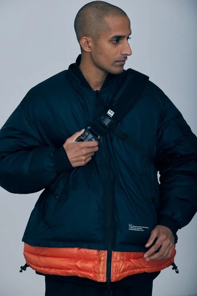 襟、袖口には水の浸透率=吸水速乾力が高い生地ドライドットを使用。ボリューム感のあるMA-1の雰囲気、個性を感じさせながらハイスペックのダウンジャケットとして昇華した製品です。