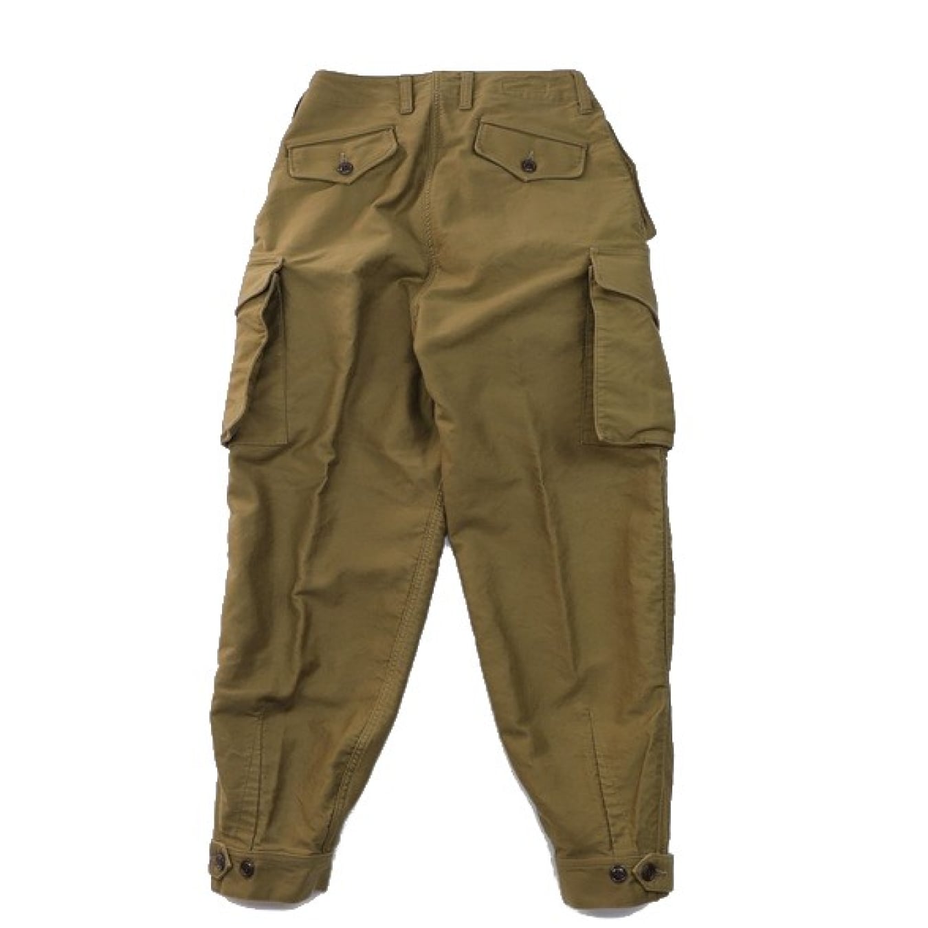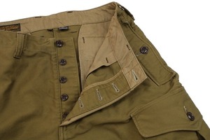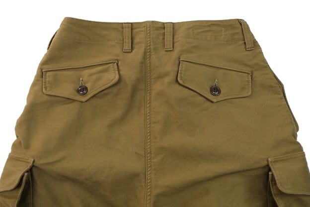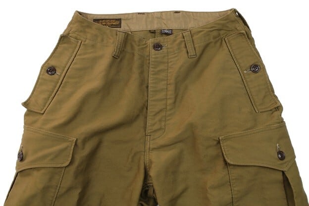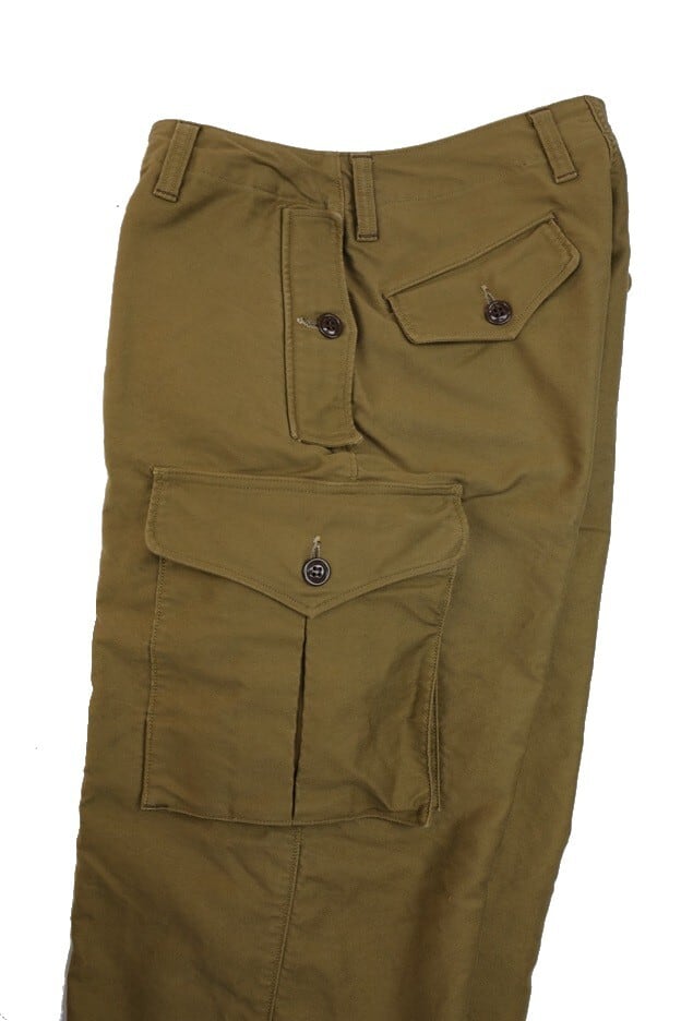 フロントはボタンフライで、サイドのポケット、カーゴポケットはボタン留めタイプになっています。またカーゴポケットはマチ付きで大きな収納が特徴です。素材にはコットンモールスキンを使用。米国産のスーピマコットンを使用したモールスキンは表面の毛羽をおさえた毛焼きが施されており、滑らかな生地感になっています。