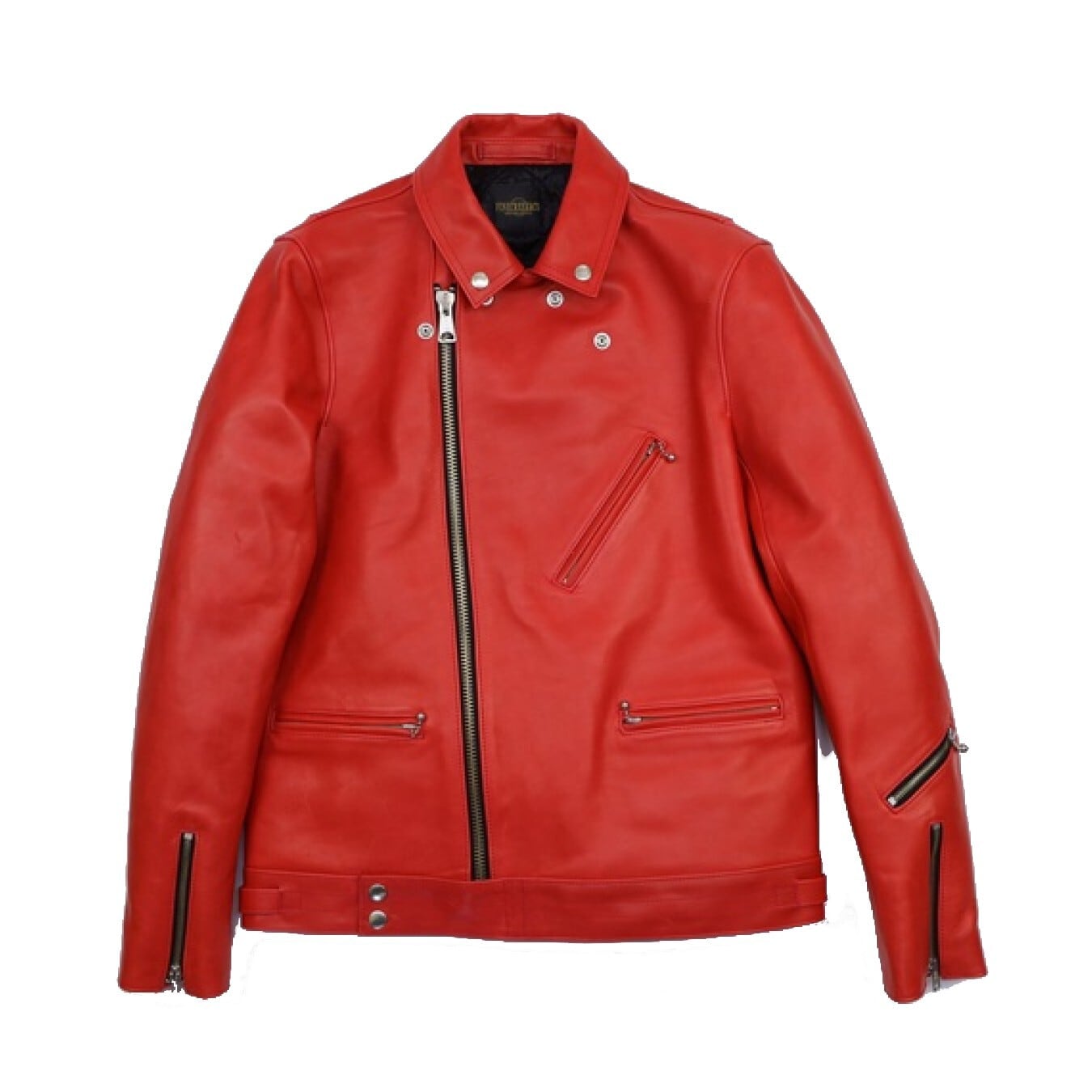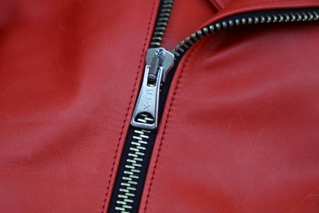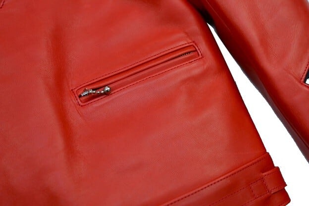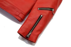 素材にはフルベジタブルタンニン鞣し1.3mm厚程度のホースハイドを使用。本製品の為に新開発されたホースハイドは染料で仕上げられた鮮やかなレッドカラー。オイルをたっぷり含んだ多指革、そしてワックス量も多く、柔らかいながら皴もしっかり残り、着込むほどに艶が増し、濃淡ある色の経年変化をお楽しみ頂けます。