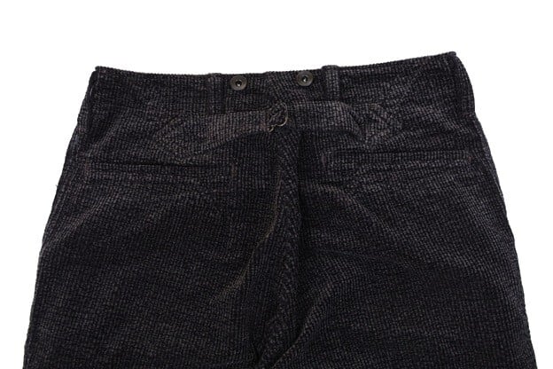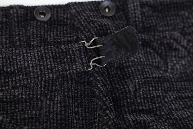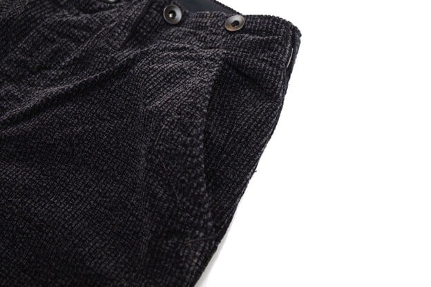 ウエストベルトの部分が身頃と一体になったディティールで、各部縫製は巻き縫い仕様、フロントのポケット口は飾りステッチが入っています。またサスペンダー取付用のタックボタンが