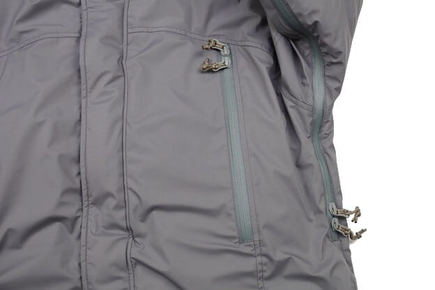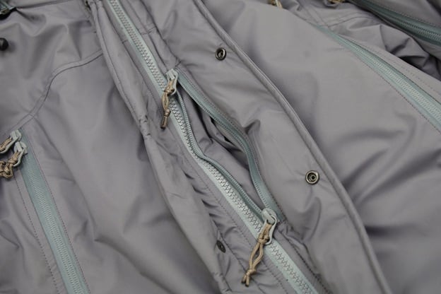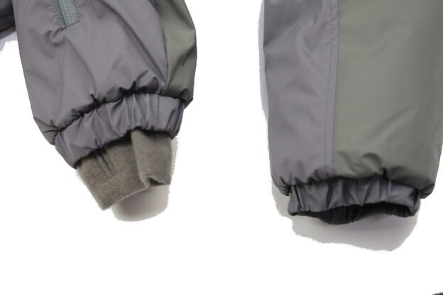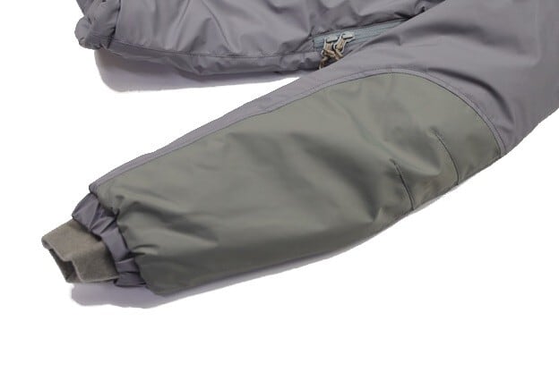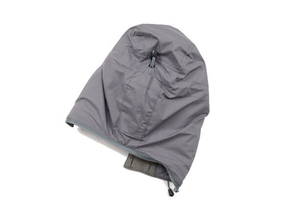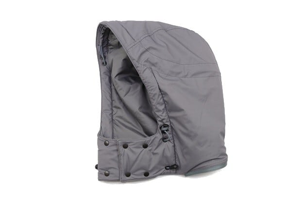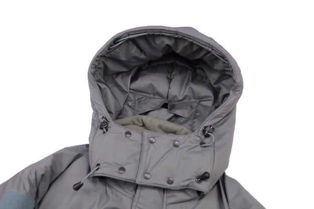 フードも非常に凝った作りで着脱出来、ヘルメットの上からでも被れる位の大き目の作りになっています。また3カ所のアジャスターでフードのフィット感を調整可能。更にフード内側には隠しポケットも付いています。襟にも中綿を内包しており、フードを脱着した際には襟もアジャスターで調整可能。肘には別生地のコーデュラナイロンを使用し、耐摩耗性も高められております。