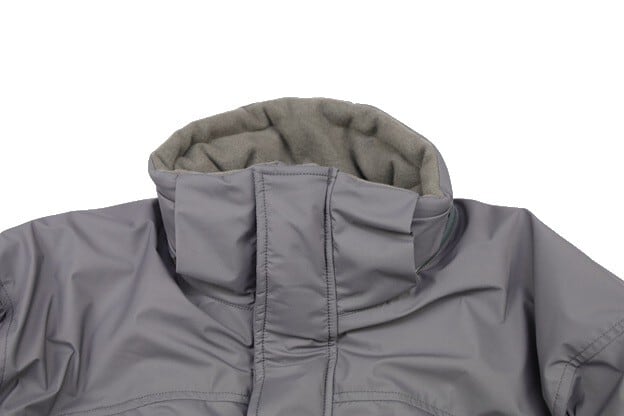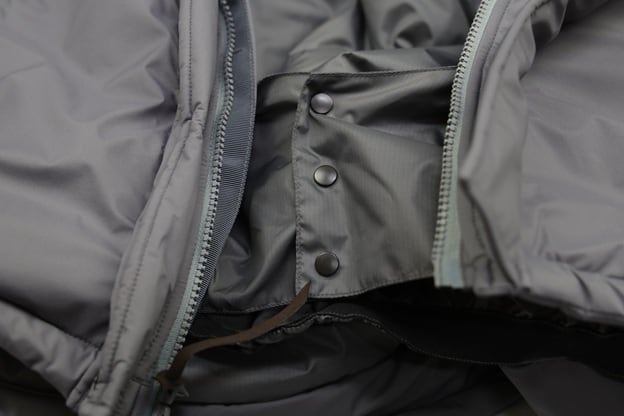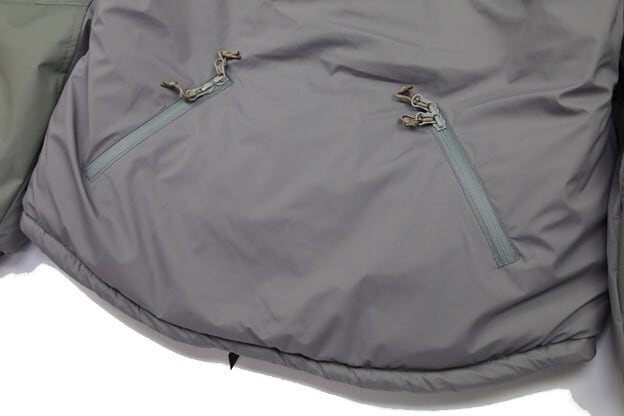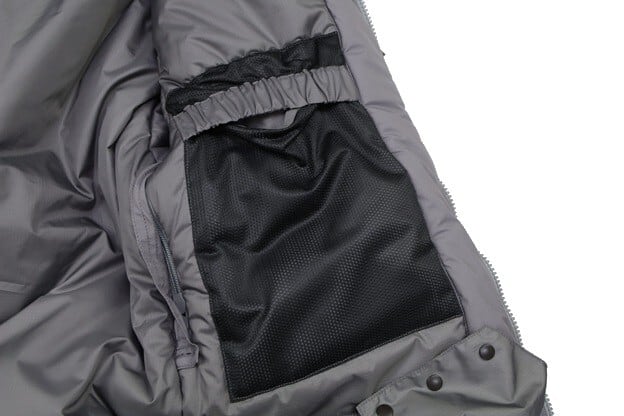 左前タテの下には隠しポケットがあるため、フロントを開けなくても物を収納するスペースを確保。内ポケットはフラップ付きのメッシュポケットが設けられており、裾からの雪や冷気を防ぐ、スノーガードも設けられています。内襟にもポケット同様の起毛素材を使用。