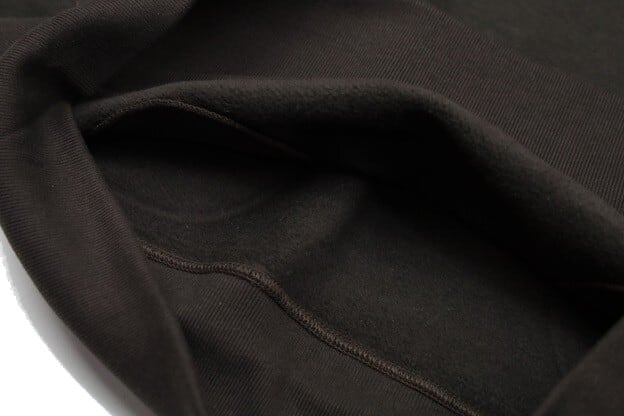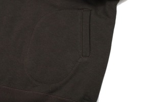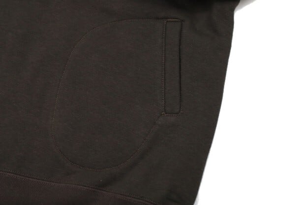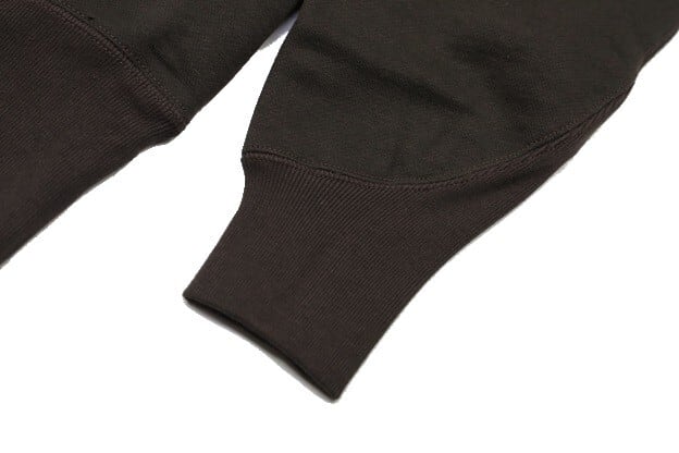 そして本製品の最も注力したスウェット生地。スウェットでは使用しないような質の高い綿を用い強撚でムラが強く太い糸をあえて使用しています。加えて厚さや固さ、コシを出すために編み機の微妙なセッティングを幾度も繰り返し、編立てられた素材。起毛は通常の2倍以上になるような工程を施して加工されています。これまでのミディアムウェイトスウェット地に比べ、1,4~1,5倍の重量となる製品は、表面がドライで固く、粗野な質感を持ちながらも裏面は毛足が長く深い起毛感を兼ね備えています。ひとめ見て、手にしてわかる他にはない特別な裏毛スウェット、着込む事による更なる風合いも含めて楽しみな一着です。