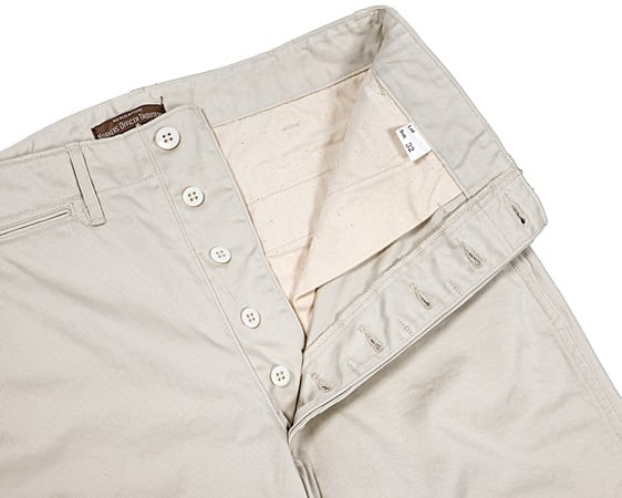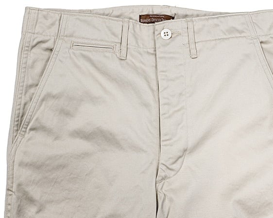 こちらの製品はType2バージョン。脇が巻き縫いのダブルステッチになった仕様になっています。素材にはコットン100%で10,5oz、チノクロスを使用。定番USMCカーキと同程度の厚みのチノとなります。パールホワイトと名付けられたカラーは、真っ白でもなく、生成りでもない、ややグレー調にも見えるような、とても良い色味でセレクトさせて頂きました。