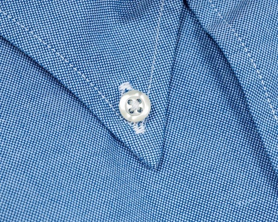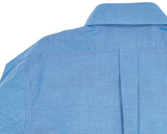 6 ボタンの特徴。台襟から身頃第一ボタンまでの距離が7 ボタンより広いため、ネクタイを絞めず、カジュアルに着るとT シャツの首元が良く見える。この首元のバランスを意識した仕様になっています。バックセンターにはボックスプリーツ、左胸にはポケットを一か所設けられ、脇は二本針のマチ仕様ではなく折り伏せ縫いの本縫いで仕上げられています。
