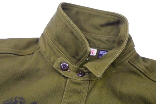 スタイルは襟にチンストラップが付くデザインで、右胸にはフラップ付ポケット、左胸には