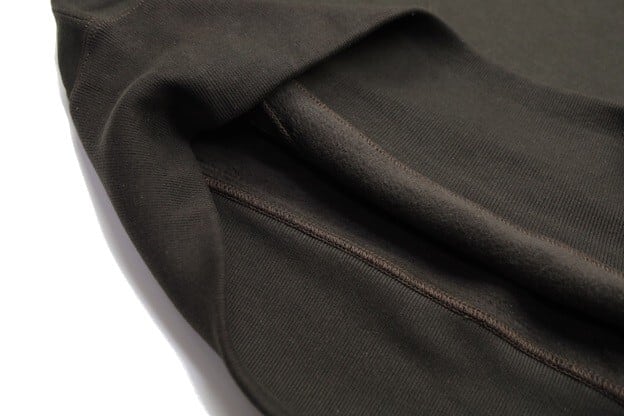 そして本製品の最も注力したスウェット生地。スウェットでは使用しないような質の高い綿を用い強撚でムラが強く太い糸をあえて使用しています。加えて厚さや固さ、コシを出すために編み機の微妙なセッティングを幾度も繰り返し編立てられた素材。起毛は通常の2倍以上になるような工程を施して加工されています。これまでのミディアムウェイトスウェット地に比べ、1,4~1,5倍の重量となる製品は、表面がドライで固く、粗野な質感を持ちながらも裏面は毛足が長く深い起毛感を兼ね備えています。ひとめ見て、手にしてわかる他にはない特別な裏毛スウェット、着込む事による更なる風合いも含めて楽しみな一着です。