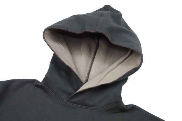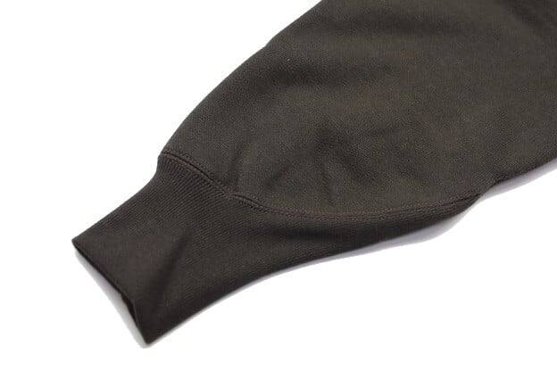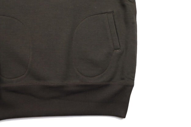 本製品は古い年代のフード付きスウェットのディティールに倣い製作されており、フード部分は裏地にミディアムウェイトのボディを用いたダブルフェイス仕様でフード端はロックミシンで処理されています。またフロントにはグローブ形状の切り込みポケットが大きな特徴となります。セットインスリーブの袖口はこちらも特徴あるV字のリブデザイン。