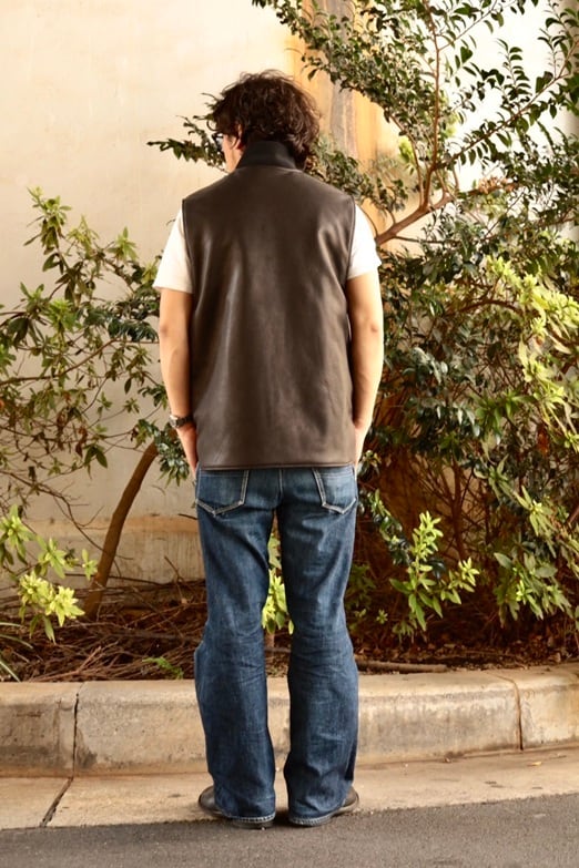 素材はディアスキン(鹿革)をフルベジタブルタンニン鞣し、0,8mm厚に割ったものを使用しており、シボ感を強調させる、ディアスキンならではの表情を活かした製品となっています。ストリートや西海岸を想起させるC社王道のベストをモチーフとしたC-WORKS初のレザーベスト。スタンドリブカラーでフロントはジッパータイプ。左右ウエストの大型パッチポケットも特徴で、裾は背面の丈が長くなっています。また中綿に高機能ハイロフトを120g使用し、ダウンベストに比べてボリュームをおさえつつ、軽量でありながら保温性も確保しています。