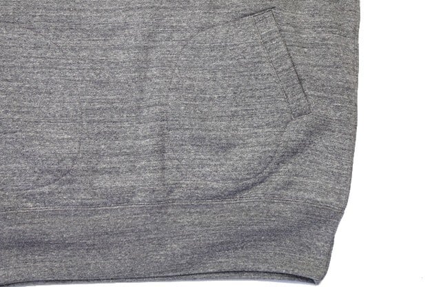 フード部分の口は、ロックミシンで処理されており、フロントにはグローブ形状の切り込みポケットが大きな特徴となります。セットインスリーブの袖口はこちらも特徴あるV字のリブデザイン。