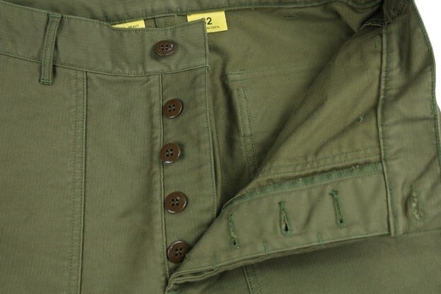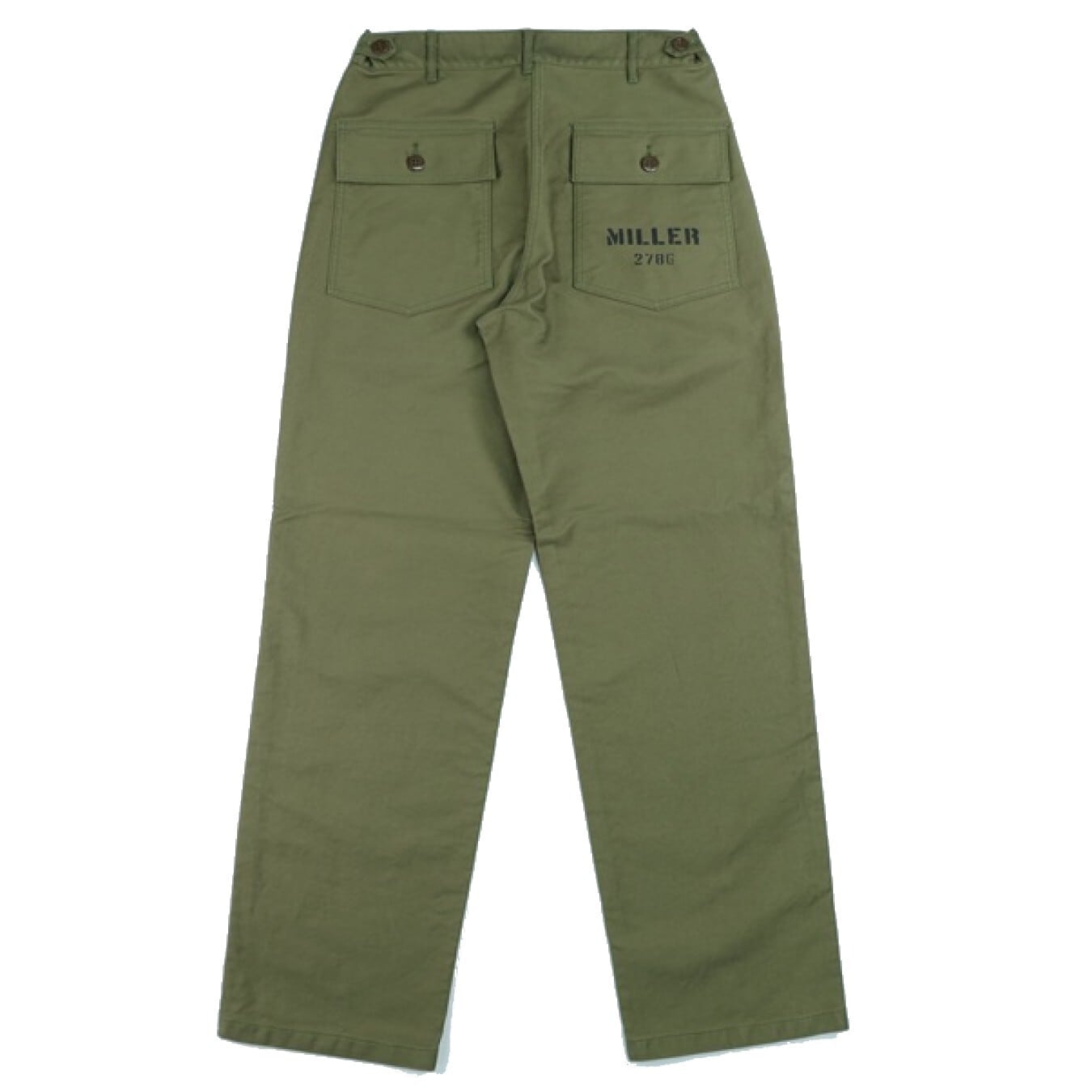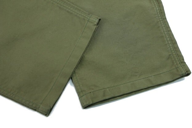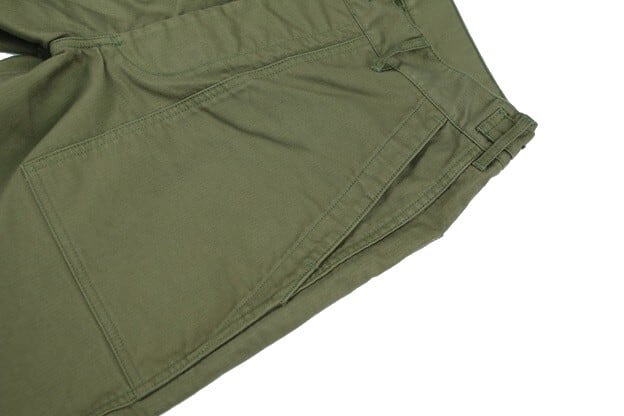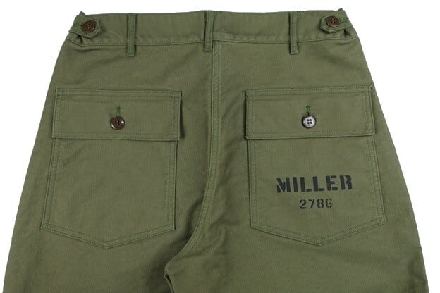 U.S.ARMYのユーティリティーパンツをモチーフに、本来バックサテンの素材をヘビーグログランにアレンジして、オリジナルの持つ迫力を高められています。お馴染みフロントのパッチポケットに、ボタンフライ仕様。ウエストサイドにはアジャスターボタンが設けられています。またバックは左右にフラップ付きポケットが設けられています。また、本製品はカスタムモデルとなり、戦地で支給されたパンツに兵士自身が施したステンシルを配置。WW II期の補給・整備兵などが愛用したリアルな存在感を感じさせます。