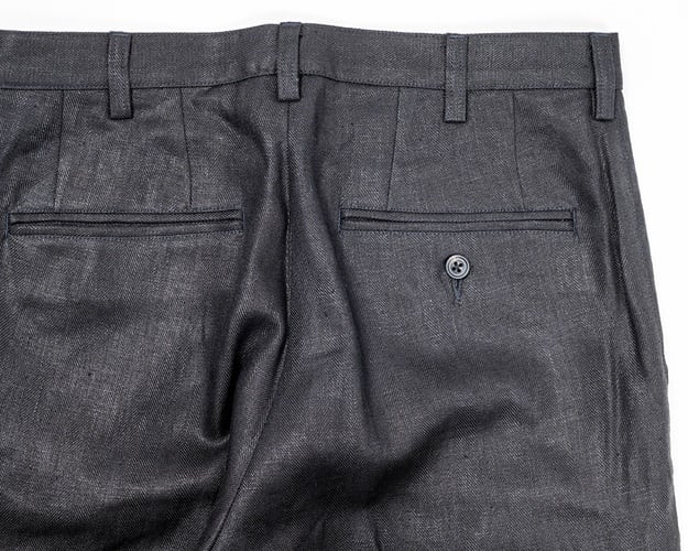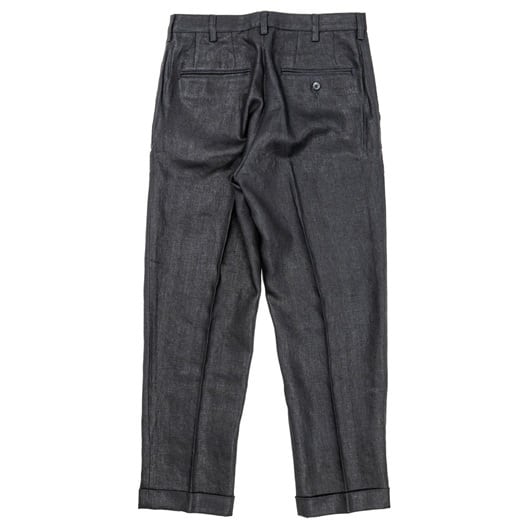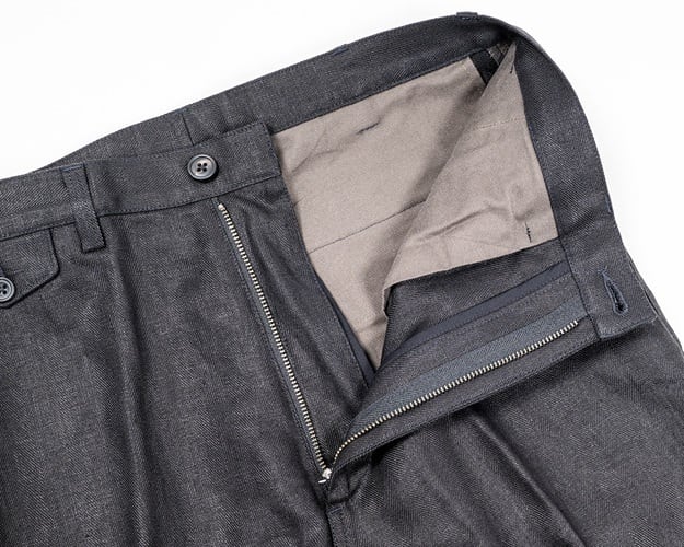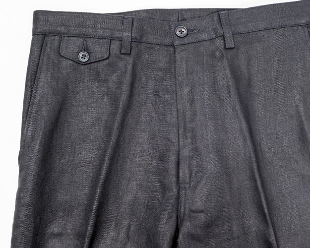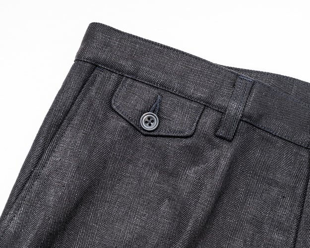 7,5ozの上質なリネン素材は、フランスノルマンディ地方のフレンチリネンを採用。重厚感あり、また独特のプルンとしたトロミを感じる生地は、へリンボン織りによって「Moonglow Trousers」にマッチした立体感を表現。本作のボタンには素材に合わせた水牛ボタンが使用されています。