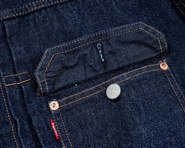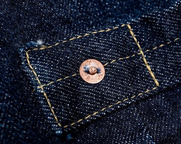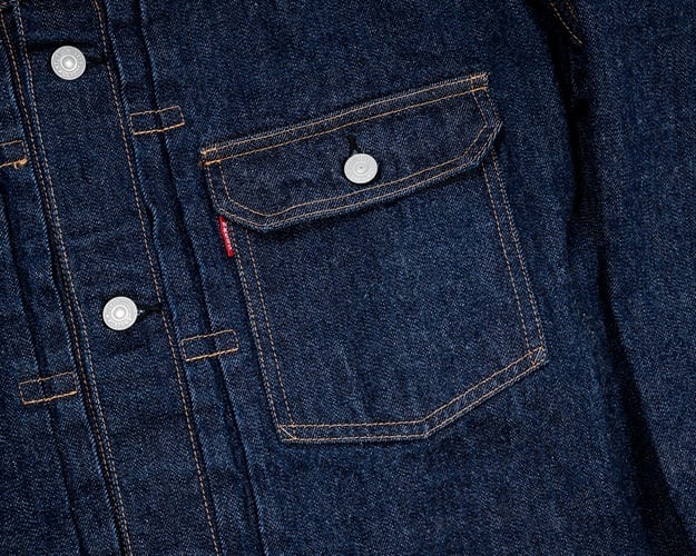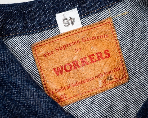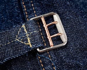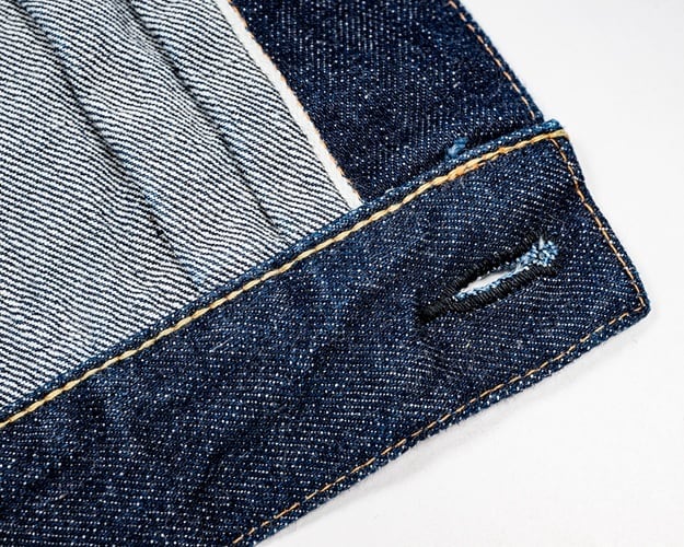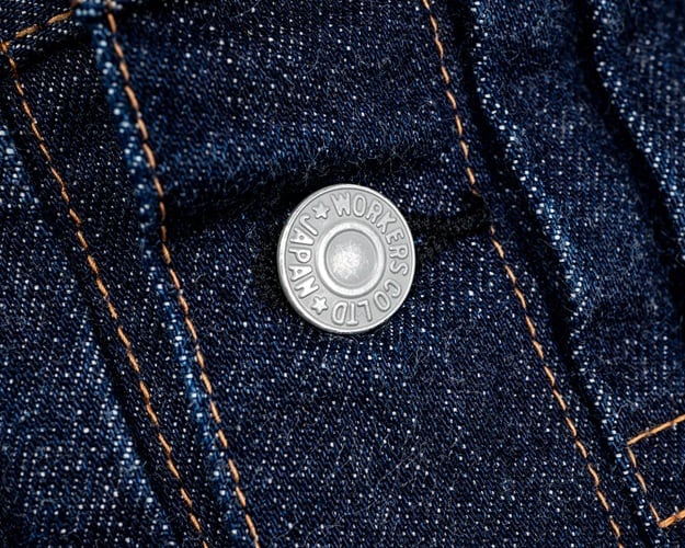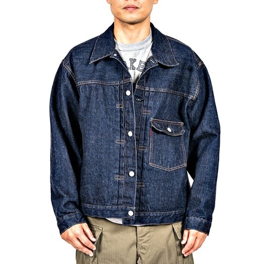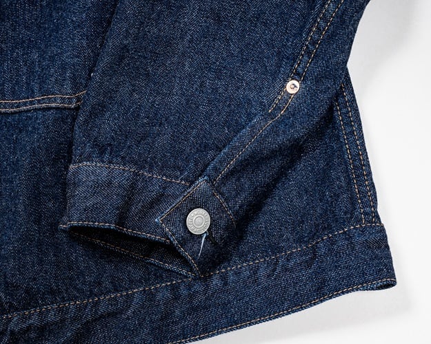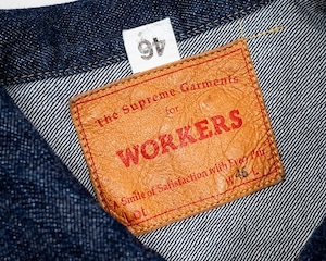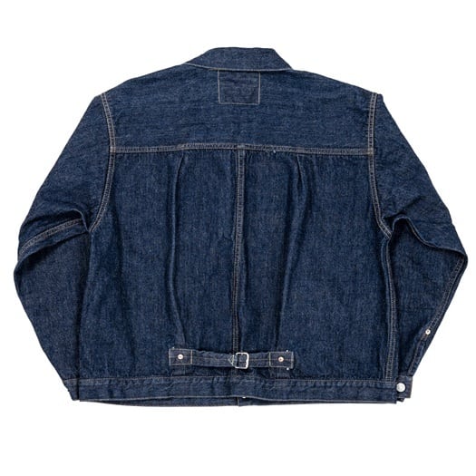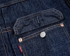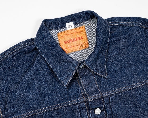 ワーカーズが手掛ける1st TYPEデニムジャケット。これまでもワーカーズではオリジナルのデニム生地を使用してジャケットは製作されてきましたが、今回の生地は大戦モデルに合わせて使用されていた(XH エクストラヘビー)デニムの製品となります。具体的にはタテ7番×ヨコ7番の米綿100、13,75ozの生地を今回は同じ米綿でタテ7番×ヨコ6番で 14,7ozと、1オンスほど重くて厚い生地を製作。インディゴも定番モデルよりも濃色に、ややタテムラ感が強くなった生地を使用しています。