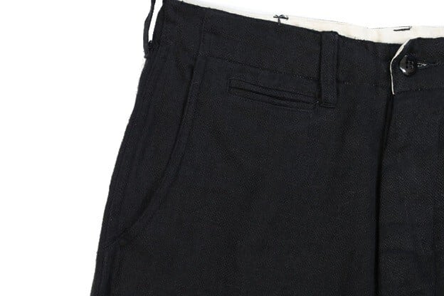 クラシックな雰囲気漂う、太めのシルエットが特徴の本製品。フロントはボタンフライとなり、尿素ボタンが使用されいています。コインポケットにスラッシュポケットが設けられ、またバックには両玉縁の深めのポケットが使いやすい41トラウザースと同様のディティールで仕上げられています。