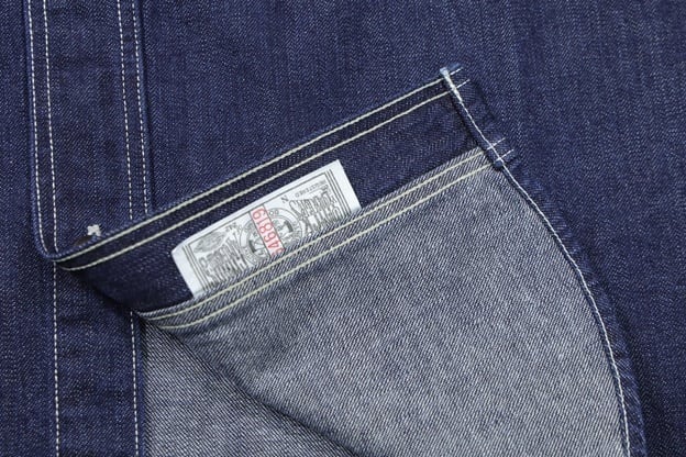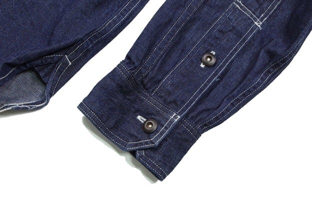 裾は緩やかなラウンド形状が無骨な雰囲気となっています。また裾裏にはユニオンチケット、脇には同生地のマチが設けられており、ボタンには鉄ボタンを使用しています。